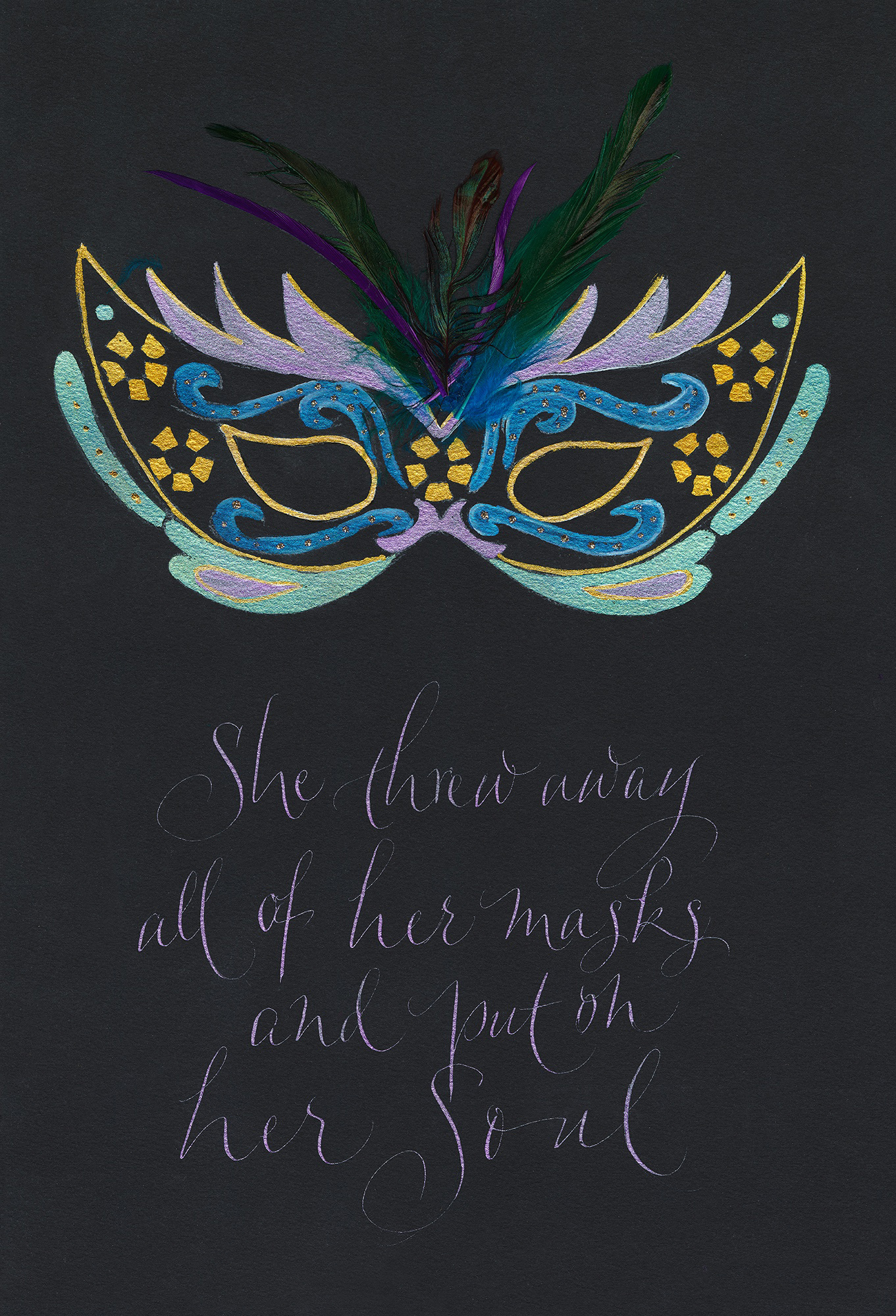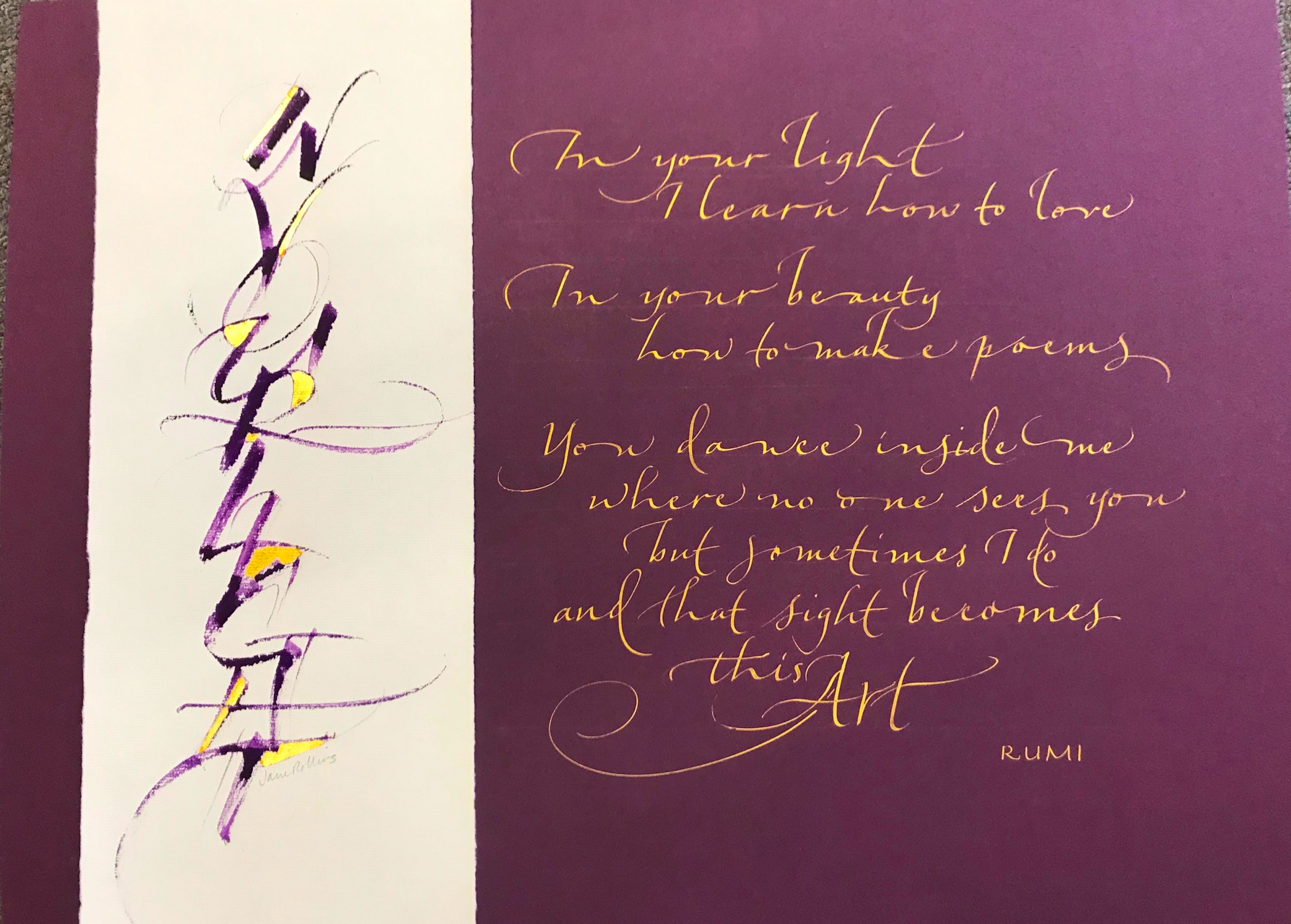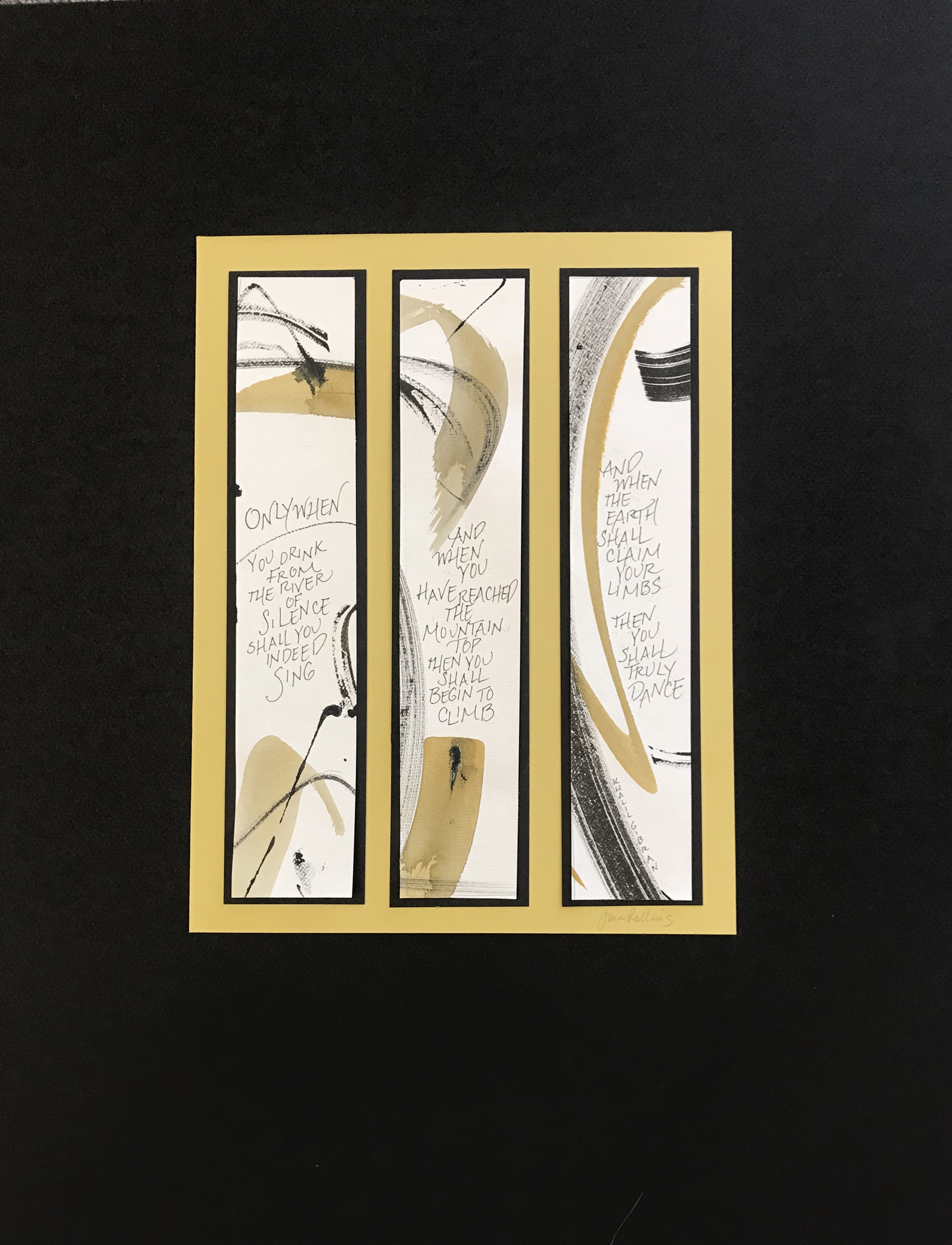 MY WORK is influenced by literature and poetry, and sometimes the words are my own. My medium of choice might be watercolors, collage or ink. My backgrounds may be paper, wood, glass, walls, or perhaps canvas. The tools I use may be traditional pens or brushes – or perhaps something more unusual such as toothpicks, popsicle sticks or handmade pens out of litho plate. These unconventional tools can be freeing and lead to more expressive works.