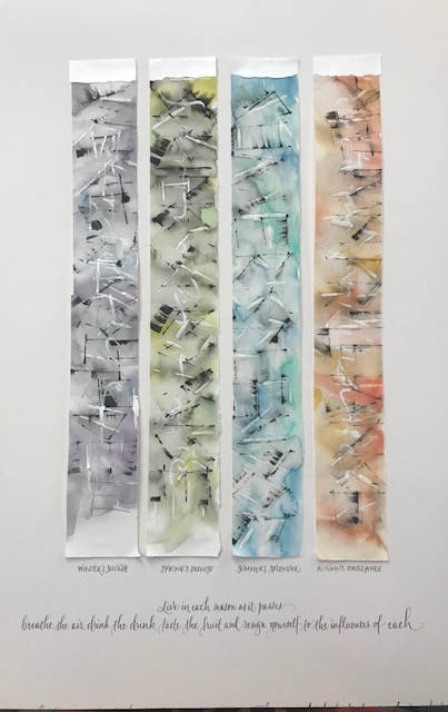 MY WORK is influenced by literature and poetry, and sometimes the words are my own. My medium of choice might be watercolors, collage or ink. My backgrounds may be paper, wood, glass, walls, or perhaps canvas. The tools I use may be traditional pens or brushes – or perhaps something more unusual such as toothpicks, popsicle sticks or handmade pens out of litho plate. These unconventional tools can be freeing and lead to more expressive works.